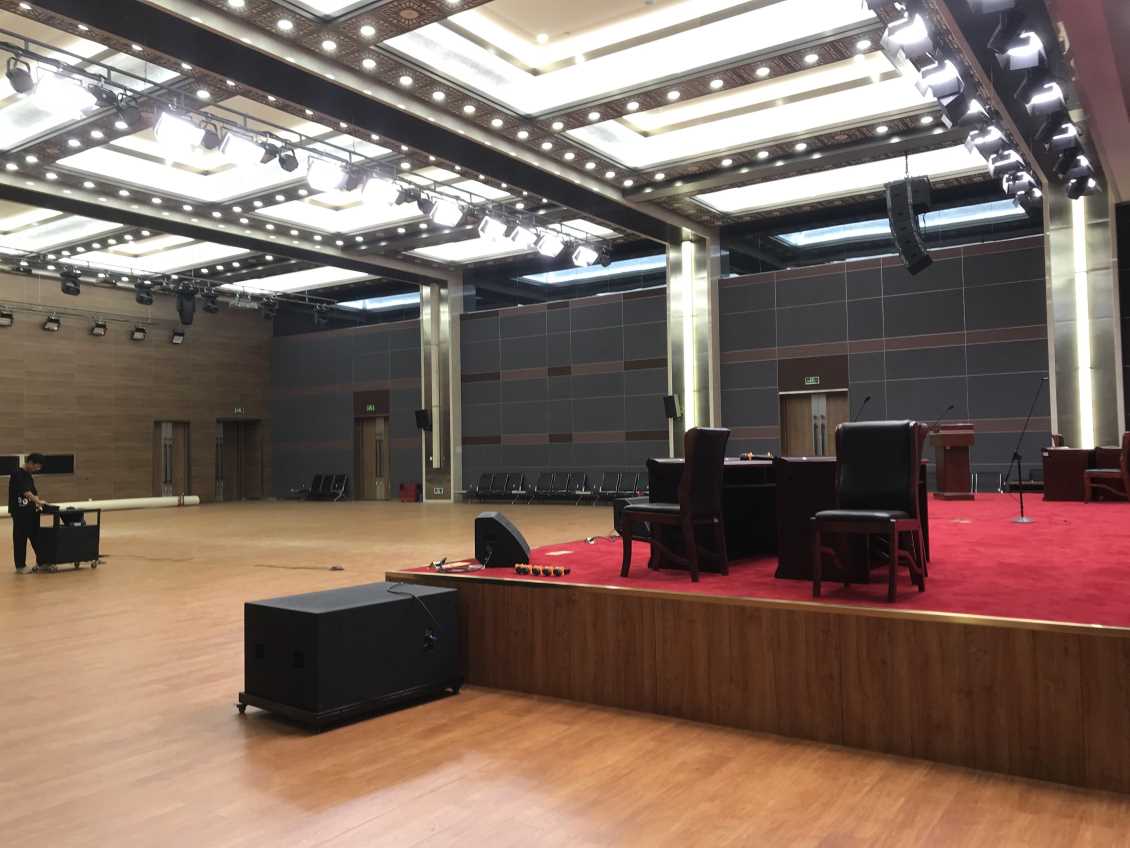 由于该礼堂面积较大,需要实现远距离,大声压的扩声,所以在江苏音箱的选择上,我们设计了四加一的线性阵列音箱组,采用专用田字架吊挂在舞台前两侧。