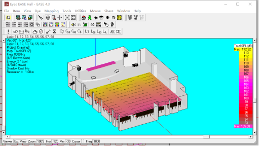 由于EASE软件可以显示厅堂建筑上江苏音箱的类型、安装位置及安装角度;显示扬声器至其声音覆盖区的直达声声线及声场的等声压级图;可显示听声面在多个重要频段电声系统直达声Direct SPL和总声压级Total SPL的计算结果及其声场的分布;显示辅音损失率ALS计算结果;显示语言可懂度C50计算结果;显示语言清晰度STI计算结果等强大功能,所以它能在设计阶段提供在一定建声条件下和一定电声条件下模拟效果的预计。可为扩声系统扬声器施工安装、施工调试提出指导性建议。EASE软件可以计算出声场相关的声学参数,其计算数据与最后的电声实测结果比较,误差可以控制在1dB以内,具有非常好的可信度,得到国际上最广泛的认可。