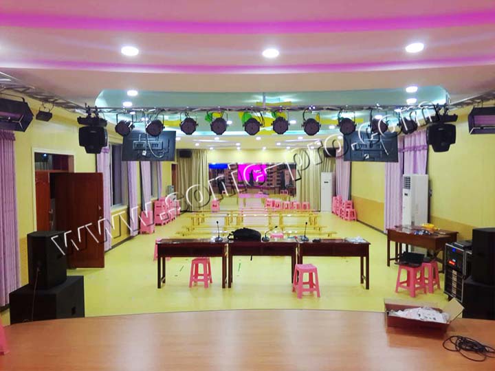 该多功能厅主要满足常规会议、小型表演等使用需求。音箱选用K系列全频音箱(主扩2只K-12、辅助2只K-10、返听2只K-10)。