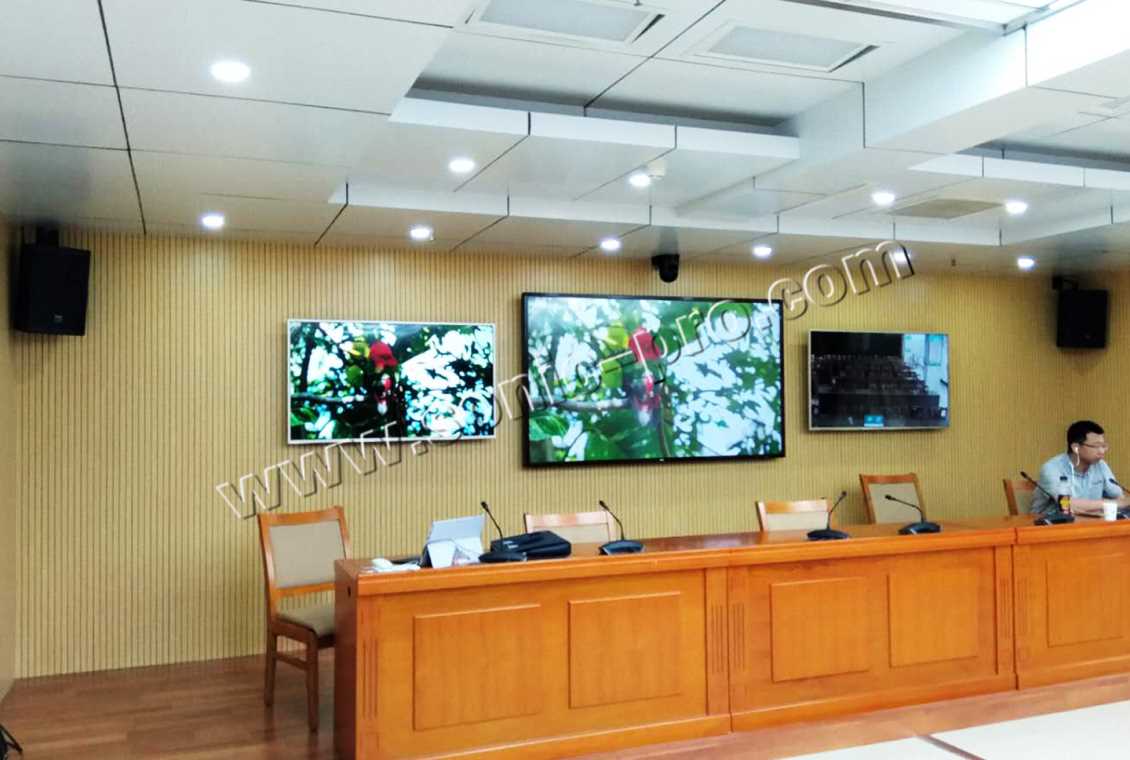 音频扩声系统的主要作用是将人声以及DVD等音源的音频信号通过集中扩声将声音清晰地传输还原,同时保证场内有足够的声压级、均匀的声场分布、足够的语言清晰度,使所有人员都能听到、听清发言内容保证会议的质量。